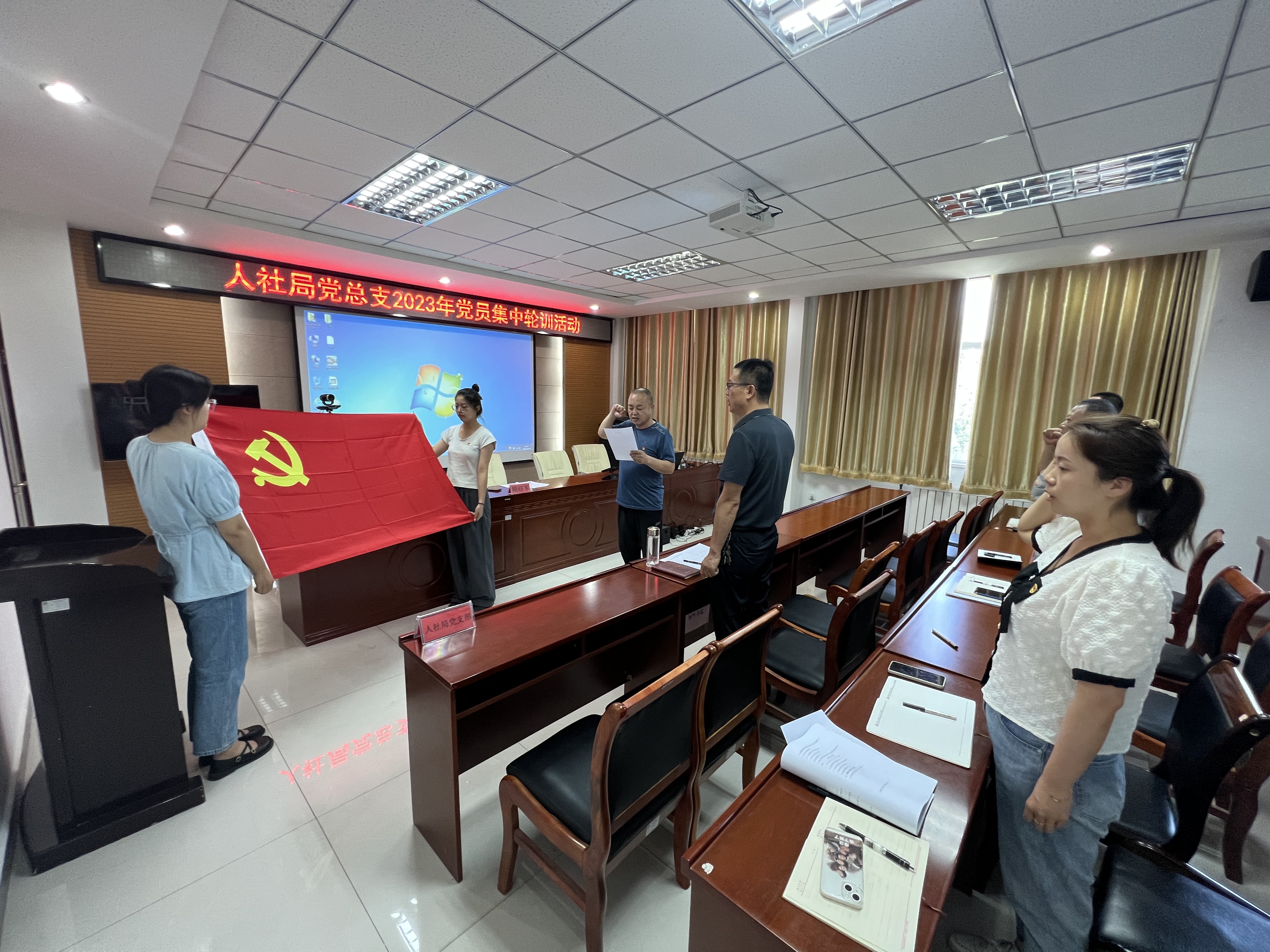 开展“重温入党誓词”活动。人社局党总支组织党员干部面向党旗进行入党宣誓,重温入党誓词,进一步增强共产党员的责任感、光荣感和使命感,引导每个共产党员时刻牢记党员身份,强化党员意识,自觉履行党员义务,践行入党誓词,在本职工作中争当模范、创先争优。