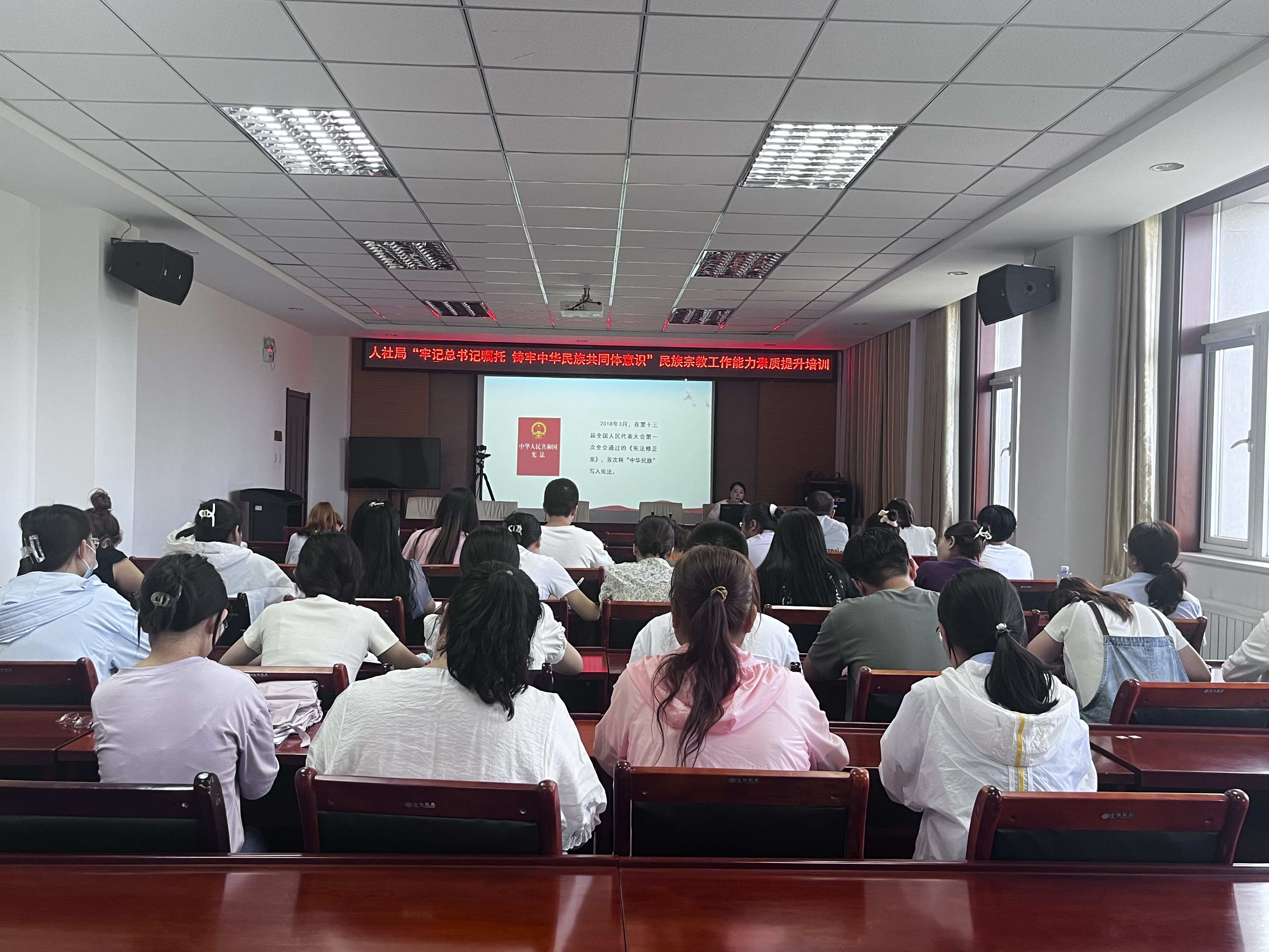 为深入贯彻落实习近平总书记关于加强和改进民族工作的重要思想,持续深化推进民族团结进步宣传教育,进一步推进人社系统干部职工铸牢中华民族共同体意识,7月5日,贺兰县人社局组织开展“牢记总书记嘱托 铸牢中华民族共同体意识”民族宗教工作能力素质提升培训班,人社系统50余名干部职工参加。