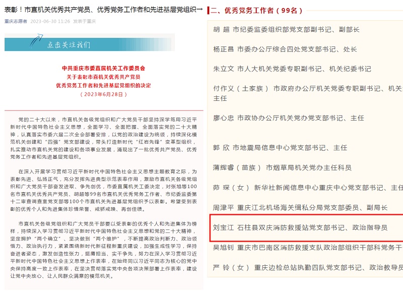 ????日前,从中共重庆市委直属机关工作委员会传来捷报,石柱县消防救援大队双庆消防站政治指导员刘宝江被表彰为“优秀党务工作者”。刘宝江,男,1989年12月出生,2010年6月参加消防工作,2008年10月入党,现任重庆市石柱县双庆消防救援站政治指导员,一级指挥员消防救援衔。????该同志政治觉悟高、业务素质过硬、工作作风扎实,扎根基层12载,尽职尽责、辛勤耕耘,具有很强的事业心、责任感和进取精神,自我要求严格,工作成绩突出。在党组织书记抓党建工作述职评议考核中,连续2年考核结果为“好”。????作为支部书记,该同志紧紧围绕“四强”党支部创建工作,认真专研党章、支部工作条例、党员发展工作细则等,严格落实各项组织生活制度,进一步细化党员发展工作,进一步规范各类台账资料;持续推进党务、业务深度融合,按期开展了换届选举工作,定期组织召开支部委员会会议、支部党员大会,及时解决了管理教育、作战训练及安全管控等工作中存在的突出问题,有效促进了双庆站健康发展。????作为政治主官,该同志主动对标“纪律队伍建设标准”,切实将主要精力放在抓教育、保稳定、促提升上。坚持把队伍正规有序、指战员健康成长作为工作目标,强调“有理有据”、“用心用情”,认真组织开展年度主题教育、日常交心谈心、“条令纲要学习月”、涉赌涉贷涉密整治等活动,不定时组织开展酒精测试、手机管理、不良借贷检查等工作;根据任务需要和队伍实际,及时调整绩效考评、轮休休假、疫情防控等具体措施,在尽力维护指战员正当权益的同时,全力确保了队伍高度安全稳定。????作为消防指挥员,该同志牢记使命,聚焦“国家队、主力军”职能定位和“全灾种、大应急”任务需求,以身作则、率先垂范,刻苦开展岗位练兵,在2022年度技能考核竞赛中取得“优秀”等次,2022年以来,带队出警318次,圆满完成了各类火灾及救援处置任务;始终牢记“人民消防为人民”理念,视辖区为家乡,视辖区群众为亲人,积极带领指战员立足本职、结合实际,发挥消防救援队伍人员及装备优势为民解忧,对于开门、取蜂窝、取戒指、救猫、救狗等等这类这些“小事”,始终秉承 “小事不小”的理念,主动作为、热情服务,不断树立新时代消防救援队伍良好形象。
