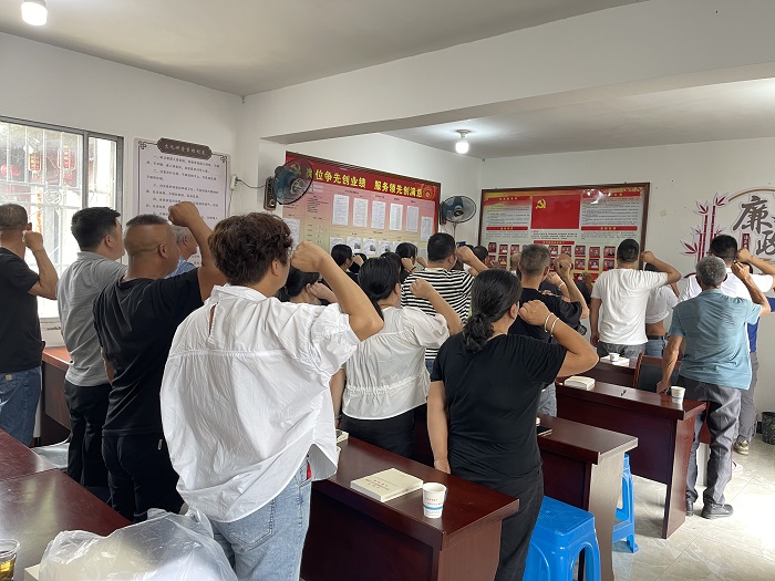 “我志愿加入中国共产党,拥护党的纲领,遵守党的章程,履行党员义务,执行党的决定……”活动中,村支部书记带领全体党员面向党旗,举起右拳,重温入党誓词,铿锵誓言传达出了作为共产党员的光荣感和使命感。