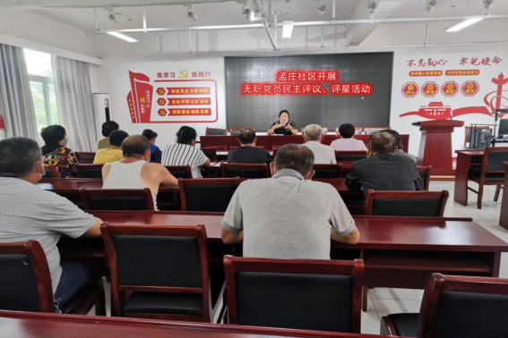 “九种岗位”凝聚活力之源。按照“按需设岗、因事设岗、以岗定责、责任到人”的原则科学设置岗位,根据社区和党员实际,共设定治安稳定维护岗、劳动就业服务岗、联系群众岗等9个岗位。我社区党员周理平结合自身实际认领了治安稳定维护岗,今年2月份与社区工作人员协助公安干警开展电瓶车整治工作,给居民宣传出行安全知识,她曾说:“作为一名退休党员,为大家服务,让我找到了退休后的乐趣。”退休不退岗,余热再生辉,在孟庄社区还有许多像周理平这样热心公益、积极奉献的无职党员。实施党员“活力工程”,党员带头亮出身份,截至目前,社区21名无职党员认领岗位38个,其中联系服务群众岗7个。