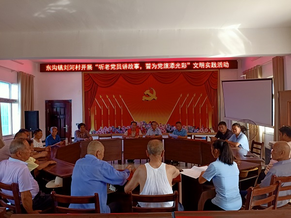 (本网讯)为加强全体党员的党性意识,提升党员精气神,大力发扬红色传统、传承红色基因,6月28日,东沟镇刘河村开展“听老党员讲故事,誓为党旗添光彩”文明实践活动。