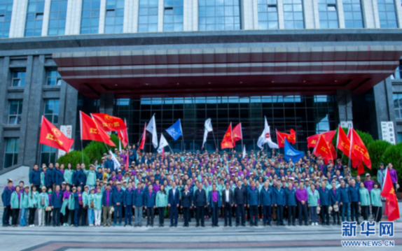 7月8日,来自北京200余家医疗单位的453位医护人员和100余位爱心志愿者合影。新华网 旦增努布 摄