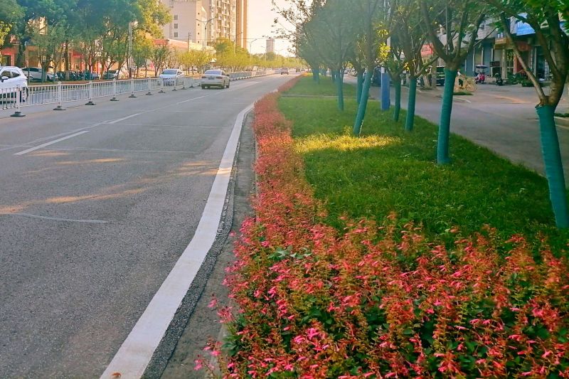 迎宾大道西段改造是我市今年城市绿网生态修复项目之一,该项目总面积约16万平方米,项目根据海绵城市、公园城市、生态园林城市等建设要求,实施城市绿地“海绵化”改造,自今年5月启动以来,目前该项目施工进度已超过50%。改造后的迎宾大道西段,3米宽的分车带像是一个微型花园,麦冬、雏菊、矮牵牛、超级一串红等绿植鲜花生长旺盛,草坪上点缀着五颜六色的花朵,美不胜收。