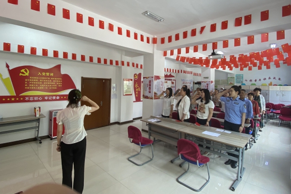 一面党旗映初心,一颗红心永向党。党员在入党誓词中回溯入党之初对党和人民的庄严承诺,进一步坚定理想信念,立足本职践行入党初心。