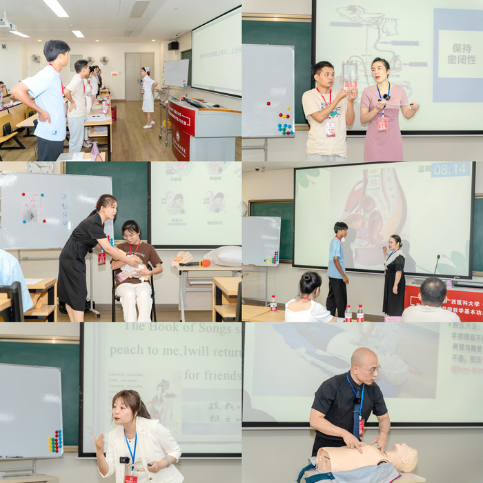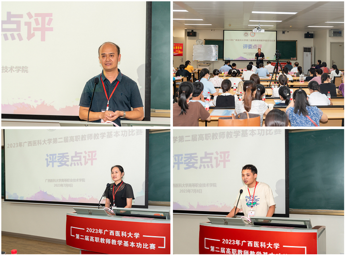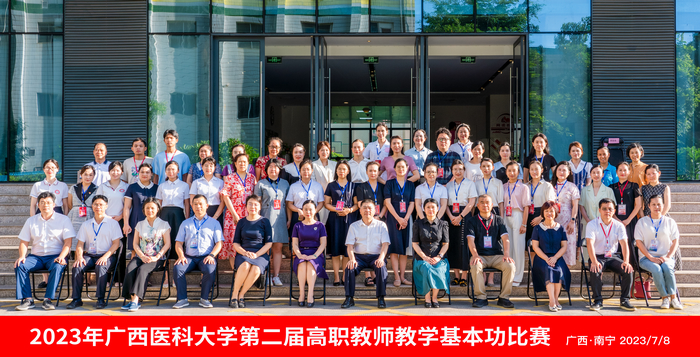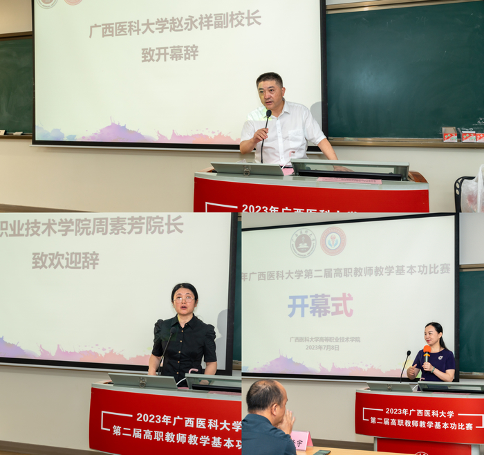为强化我校高等职业教育教师技能及“双师型”教师队伍建设,提高人才培养质量,推动我校高职教育教学改革,7月7-8日,高等职业技术学院在卓越楼五楼第12教室举行2023年广西医科大学第二届高职教师教学基本功比赛。大赛特邀原学校教评中心主任林军担任比赛评委组组长,学校教务处处长刘登宇教授及学校高职各教学单位的专家共9人为教师评委,向婷等6名同学为学生评委。来自我校高职各教学单位的30名选手参加了比赛。学校赵永祥副校长、高职院周素芳院长、谭珍媛副院长、莫税英副院长以及高职各教学单位的领导出席了开幕式,开幕式由谭珍媛副院长主持。