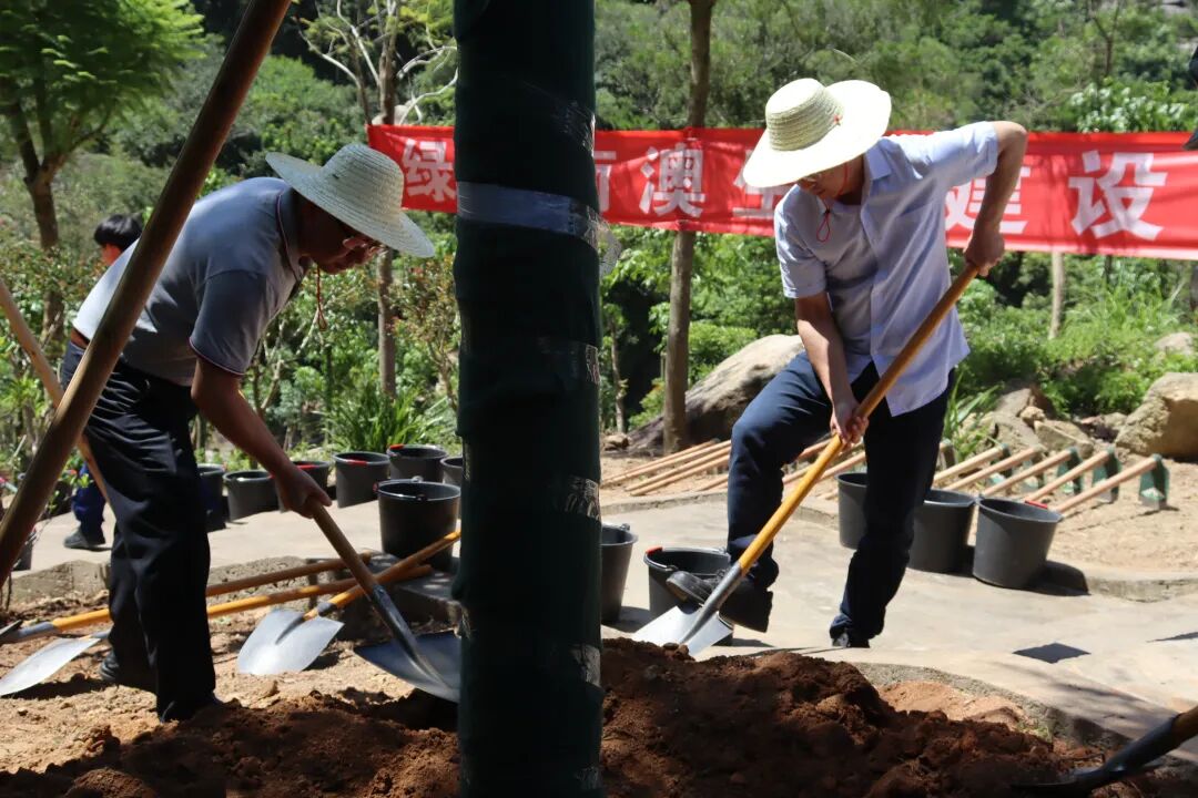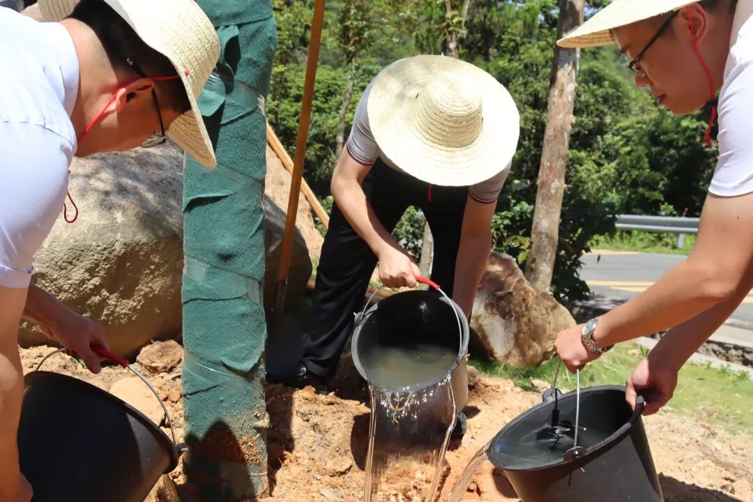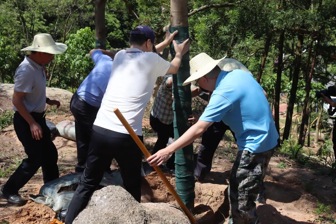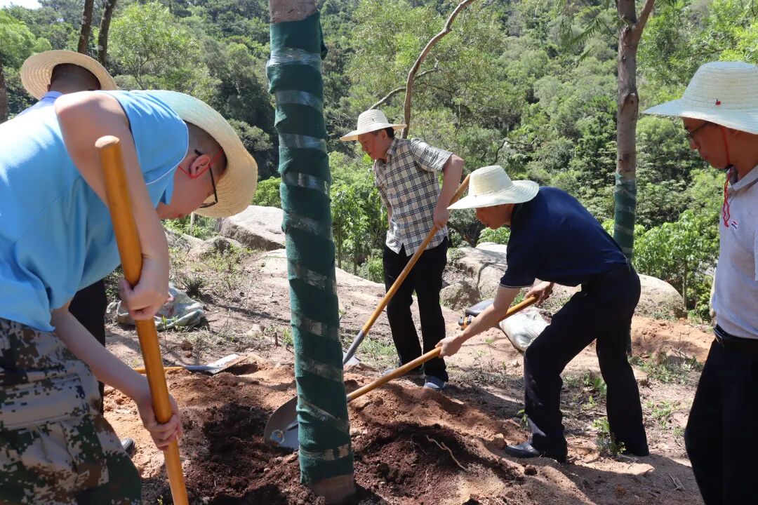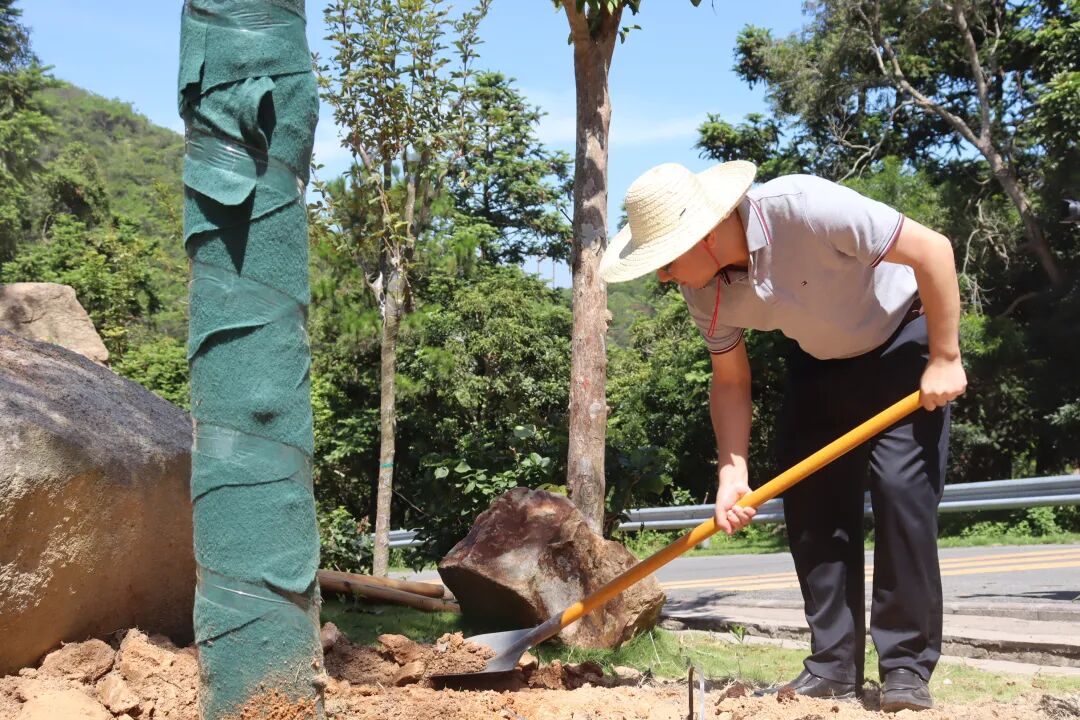 植树现场,张林等县领导与工作人员分工配合,一同扬锄挥铲,培土扶树,踩实新土,提水浇灌,共同为南澳生态建设增添绿色动能。按照适地适树原则,本次活动种植了凤凰木、澳洲火焰木、紫花风铃木、黄花风铃木等乔灌木约2000株。