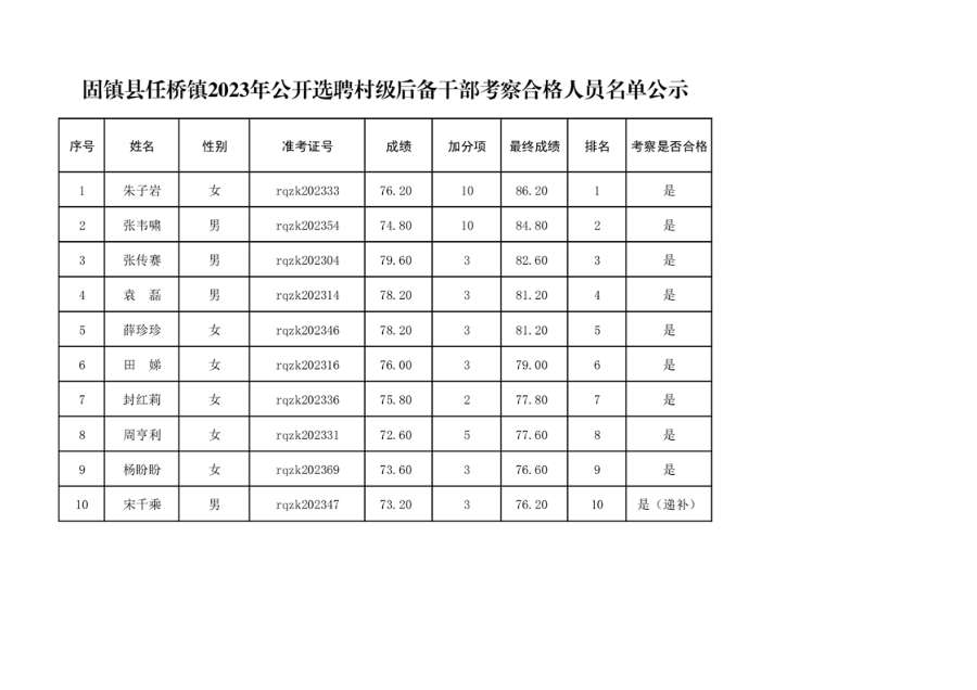固镇县任桥镇2023年公开选聘村级后备干部考察合格人员名单公示