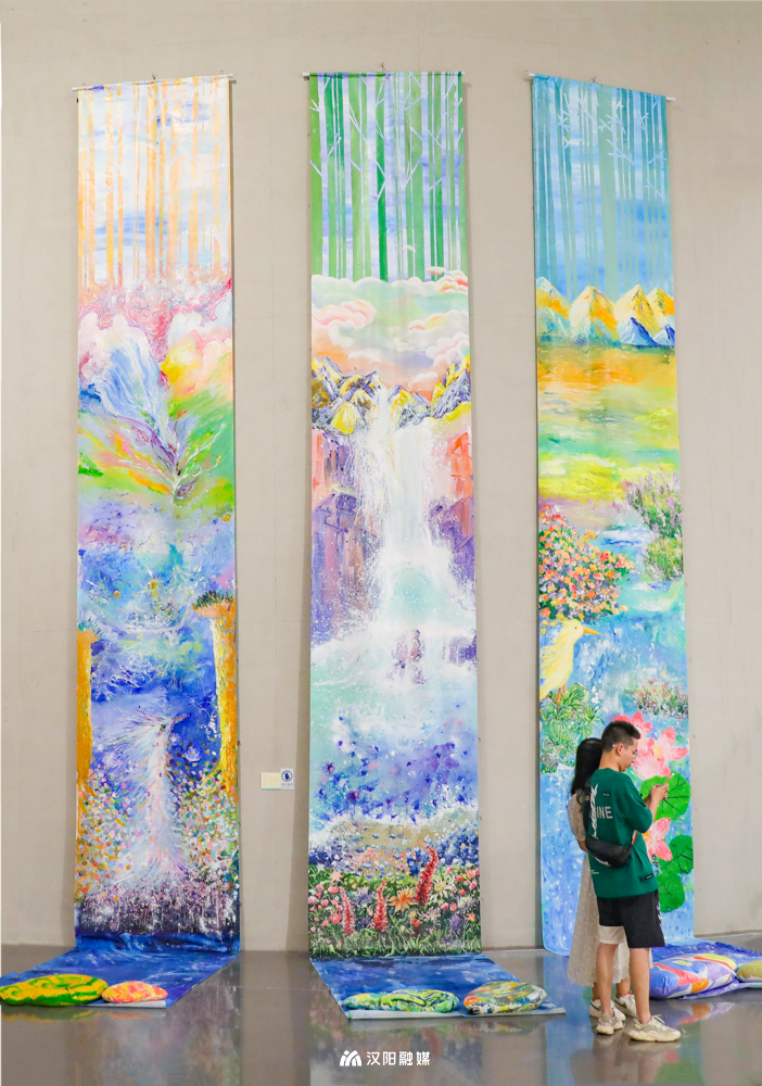 两个展厅外,一幅长达10米的多彩画卷吸人眼球。这是由艺术家熊汉强和十几位小朋友合力创作完成。每一笔都是对湿地、生态的表达,每一道色彩都是他们对自然和生命的思考。