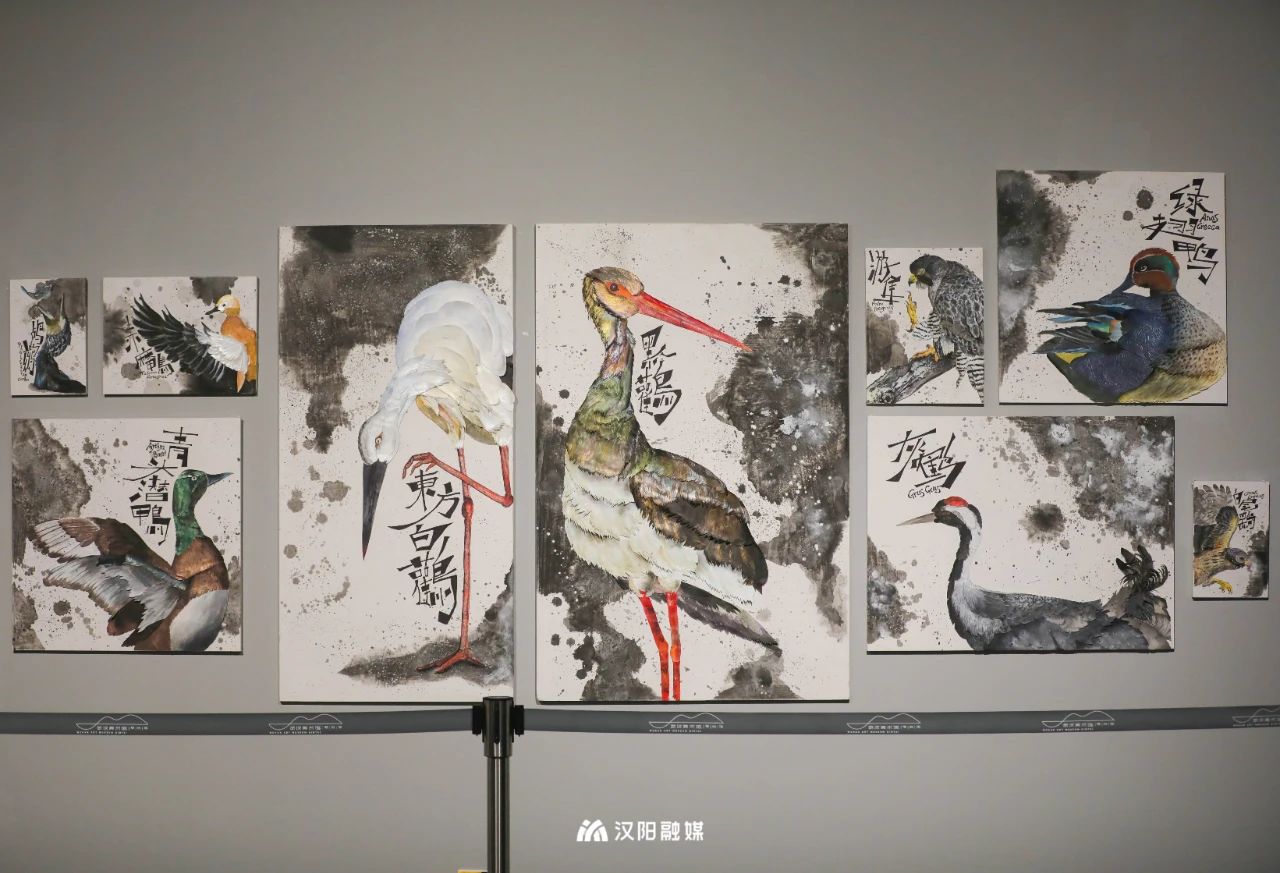《鸟集鳞萃》由19幅画作集合而成,创作对象皆为武汉周边湿地“明星水鸟”。《江城组图》作品中,作者们站在蛇山之巅遥看两江三岸的视角进行创作,绘制出人与自然和谐共生的生态家园。
