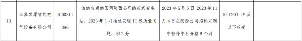 根据通报显示,江苏其厚智能电气设备有限公司供国网陕西公司的箱式变电站,2023年1月抽检发现II级质量问题,积2分。2023年5月5日-2023年11月4日在陕西公司招标采购中暂停10(20)kV及以下箱变中标资格6个月。