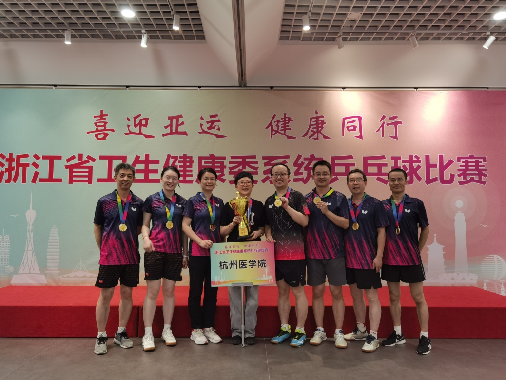 2023年7月16日,浙江省卫生健康委系统乒乓球比赛在省职工活动中心举行。委系统共有11只队伍、110多名运动员参加混合团体赛。比赛分两个阶段进行,第一阶段分组单循环赛取前三名;第二阶段小组进行淘汰加附加赛决出 1-6名。在比赛中,我校参赛队员勇于拼搏、力克群雄,一举夺冠。