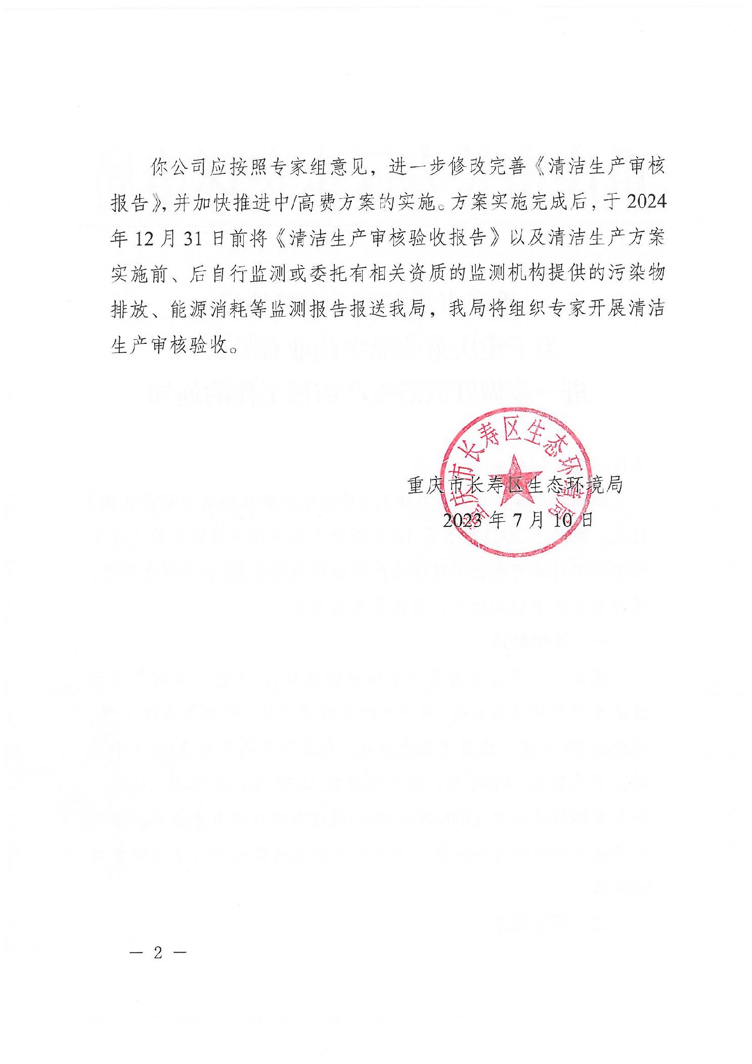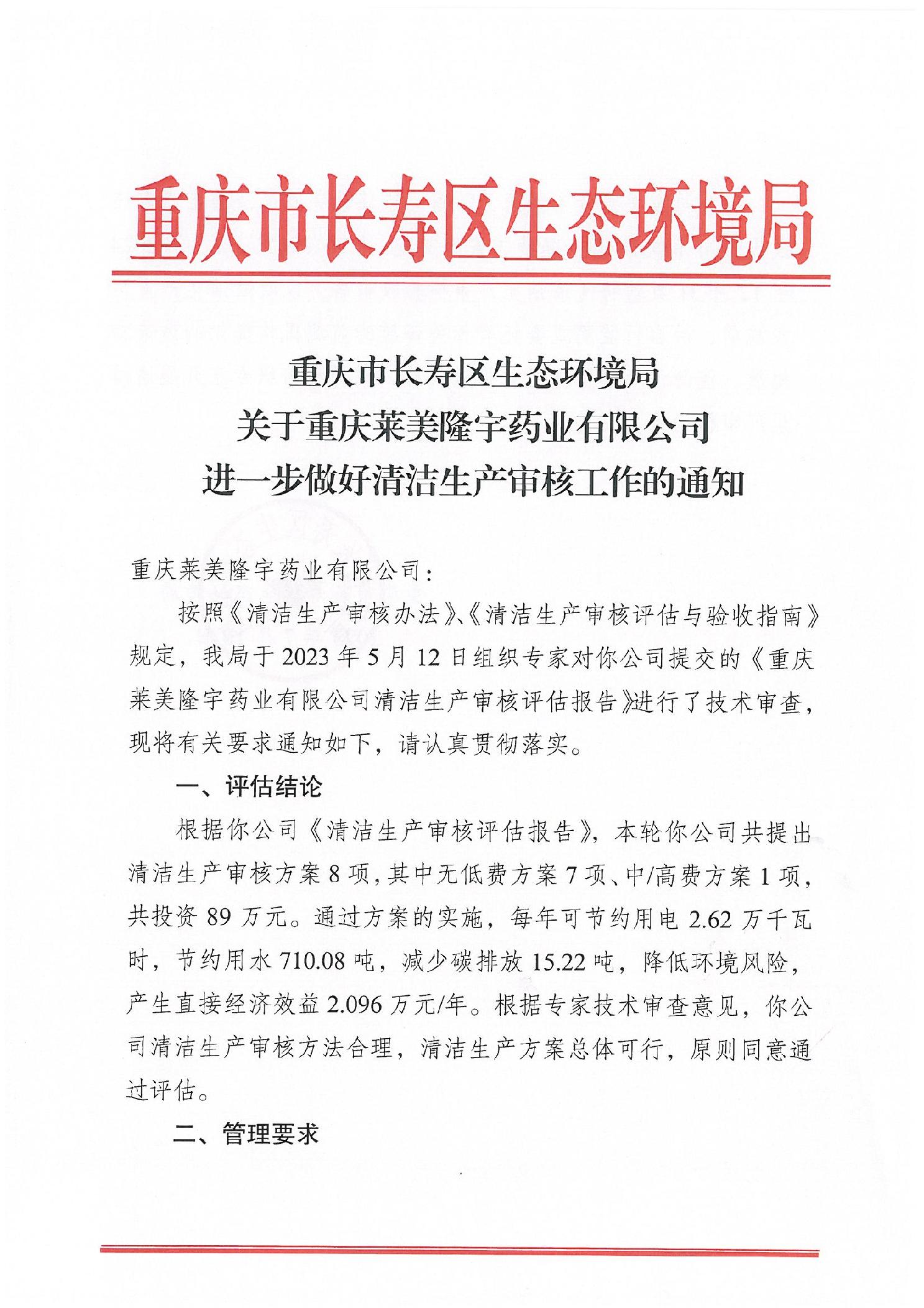 关于重庆莱美隆宇药业有限公司进一步做好清洁生产审核工作的通知