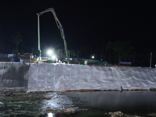 海南省2022年度病险水闸除险加固工程在台风到来前通宵进行北岸水闸围堰边坡模袋混凝土浇筑