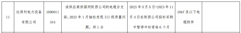 根据通报显示,达得利电力设备有限公司供国网陕西公司的电缆分支箱,2023年1月抽检发现III级质量问题,积1分。2023年5月5日-2023年11月4日在陕西公司招标采购中暂停10kV及以下电缆附件中标资格6个月。
