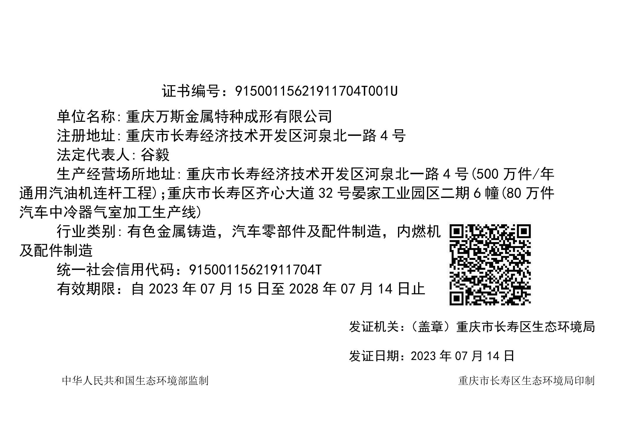 重庆万斯金属特种成形有限公司排污许可证