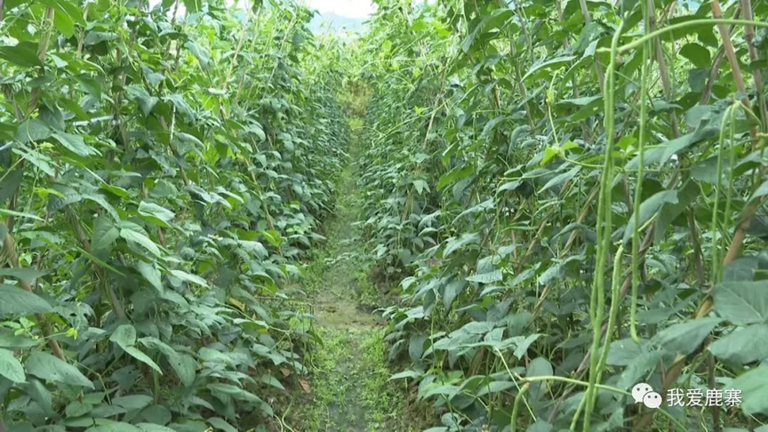 在寨沙镇古木村料旺屯豆角种植地里,一排排整齐的支架上爬满了豆角藤蔓,一根根绿油油、饱满的豆角垂挂在支架两旁,村民郭彦红等人在地里来回穿梭,动作娴熟地挑选采摘成熟的豆角。