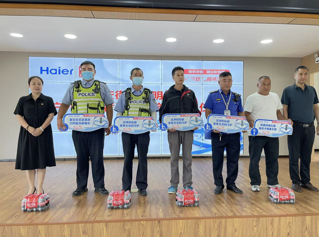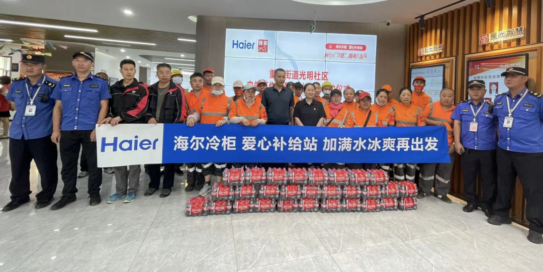 7月21日,重庆街道光明社区新时代文明实践站携手海尔公司举行爱心补给站“爱心冰柜”——致敬户外酷暑工作者公益活动启动仪式,为户外工作者送关怀。