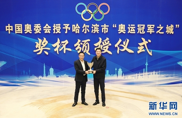 中国奥委会授予哈尔滨市“奥运冠军之城”奖杯。新华网 才萌 摄