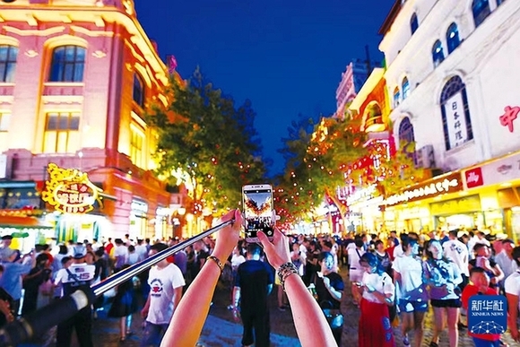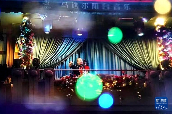 在哈尔滨中央大街,演员在马迭尔阳台音乐会上演奏。新华社记者 王建威 摄