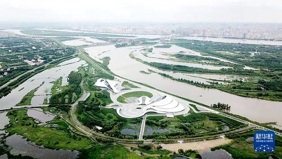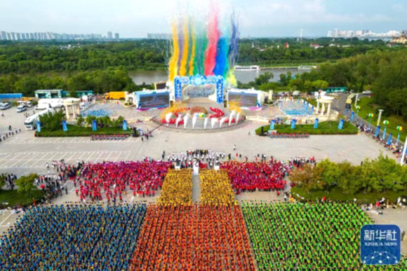在哈尔滨市太阳岛景区太阳石广场举行中国哈尔滨市获得2025年第九届亚洲冬季运动会举办权庆祝仪式现场(无人机照片)。新华社记者 张涛 摄