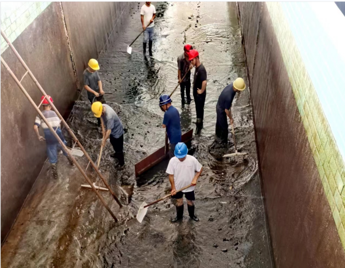 为确保清洗工作有序开展,公司党委书记、董事长李照球亲临现场指挥调度。清洗人员使用高压水枪、刮板、刷子等工具对沉淀池的池壁和池底进行反复清洗,随后使用专业消毒剂对水池进行彻底消毒,保障水池的清洁卫生。公司检修人员同步检修水池排泥设备,快速完成拆卸、测试和维护等工作,确保沉淀池设施设备运行正常。全体清洗人员不怕苦、不怕累,浑身被汗水、污泥水浸透也毫不在乎,每个步骤都按照预定的计划有序进行。大家齐心协力、配合默契,克服水池内潮湿闷热环境,经过2天的艰苦奋战,在预定时间内完成了清洗工作,经城乡供水水质检测中心检测人员对水质进行多次抽样检测,出厂水水质符合《生活饮用水卫生标准》。