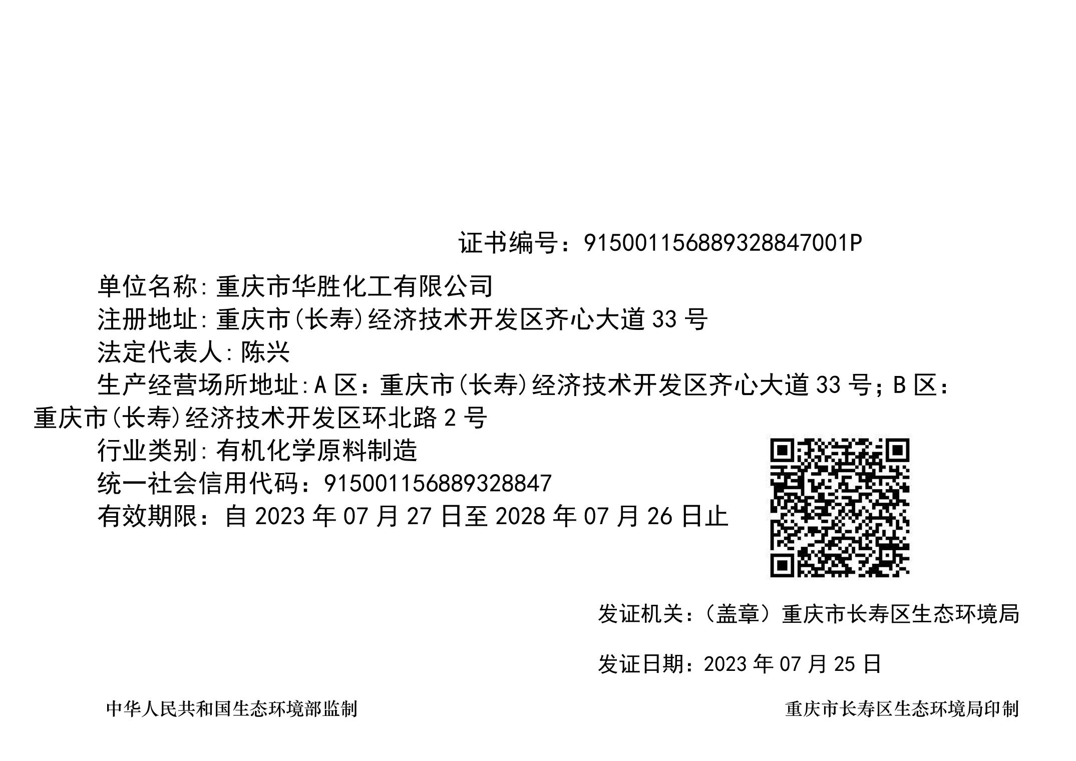 重庆市华胜化工有限公司排污许可证