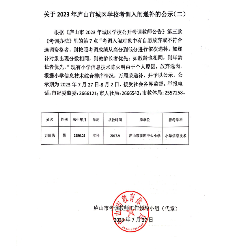 关于2023年庐山市城区学校考调入闱递补的公示(二)
