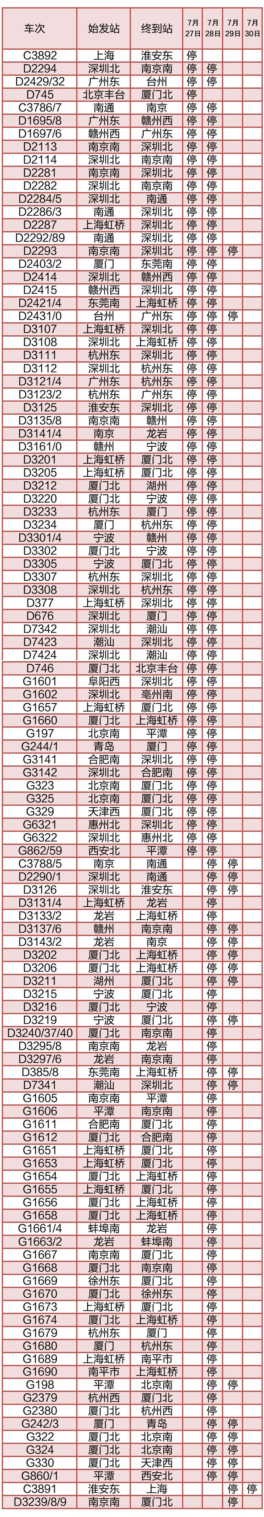 受台风“杜苏芮”影响停运车次信息表(截至7月26日22:00)