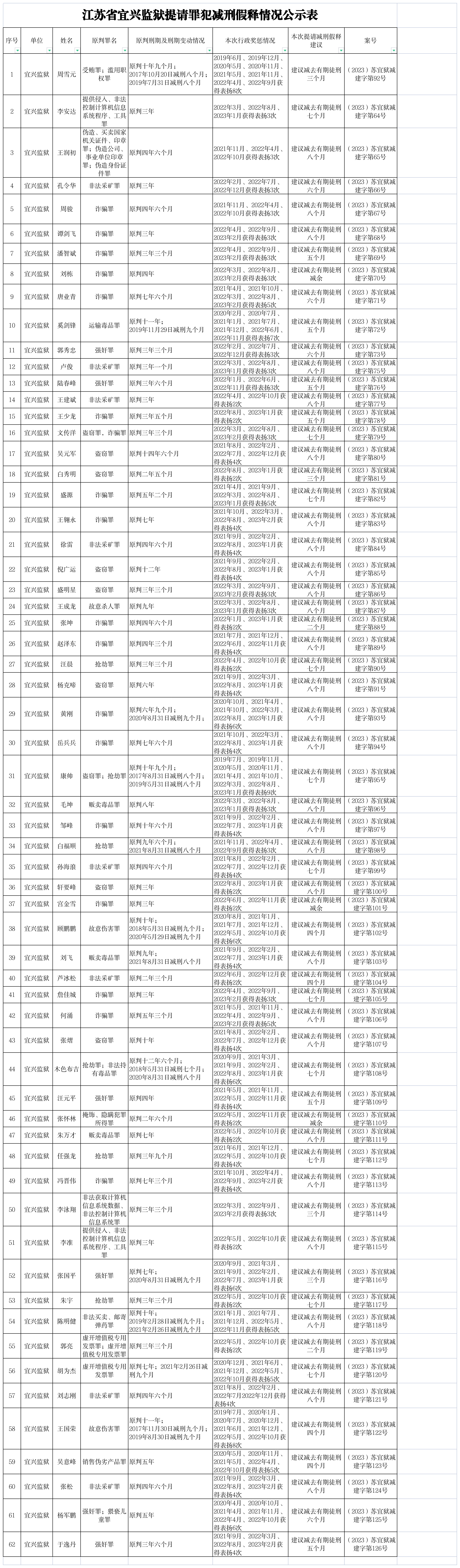 江苏省宜兴监狱提请罪犯减刑假释情况公示表