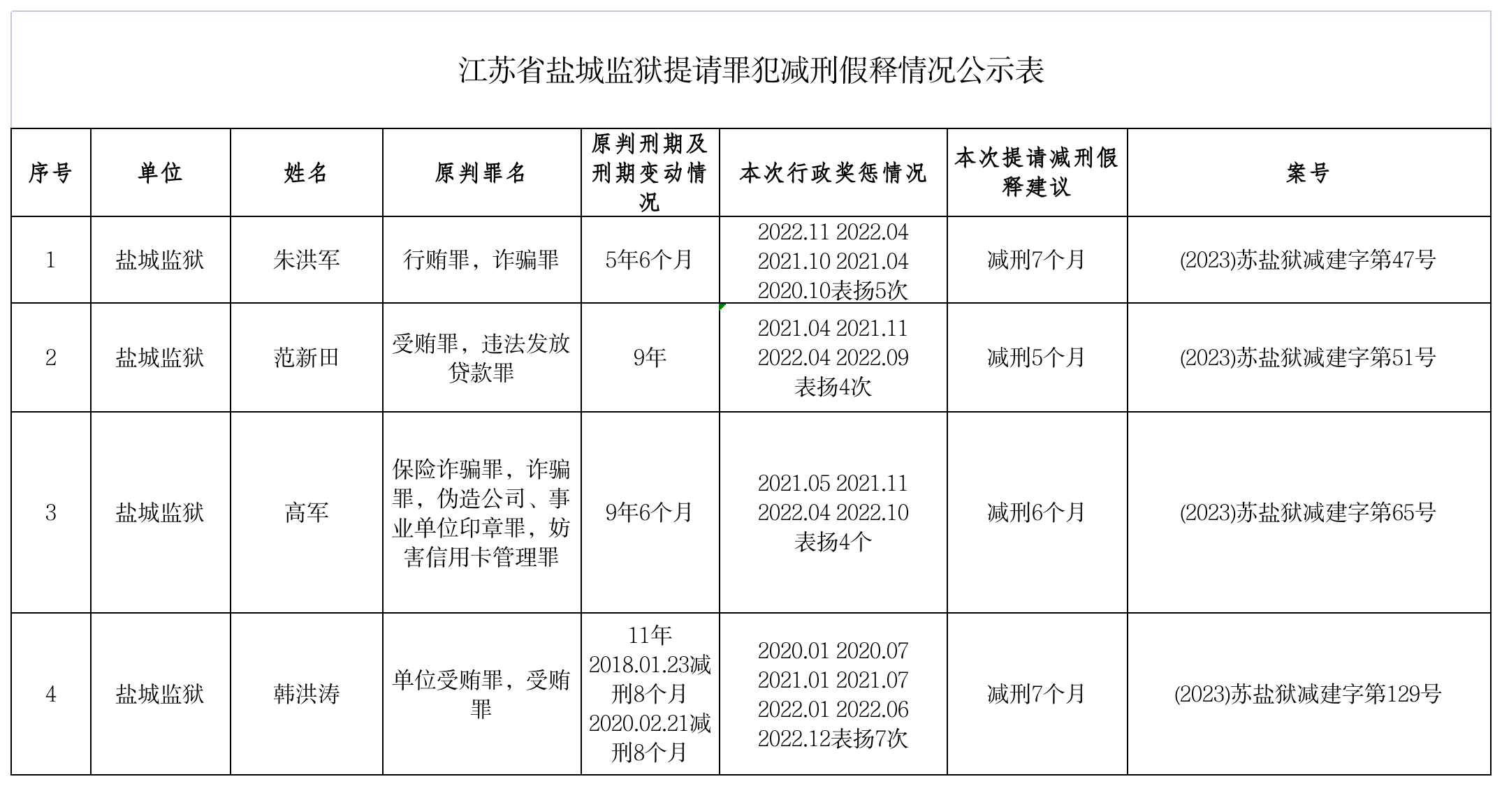 江苏省盐城监狱提请罪犯减刑假释情况公示表