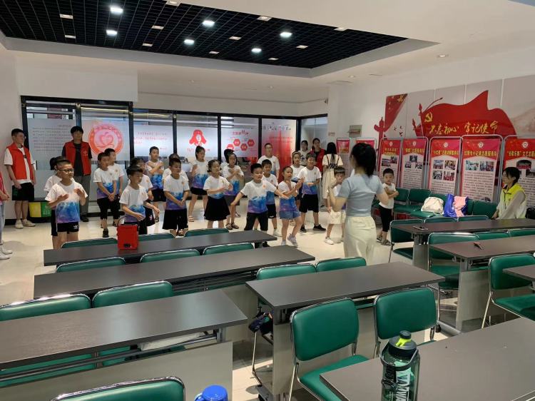 开班仪式结束后,暑托班的小朋友们迎来了开班第一课——律动青春。老师先是带领小朋友们进行了简单的破冰小游戏,活跃课堂气氛。随后,小朋友们跟随老师的舞蹈动作,在欢快的音乐声中开启充满元气的一天。新时代文明实践中心的笑声不断,每个人都很快融入了这个暑托班大家庭。