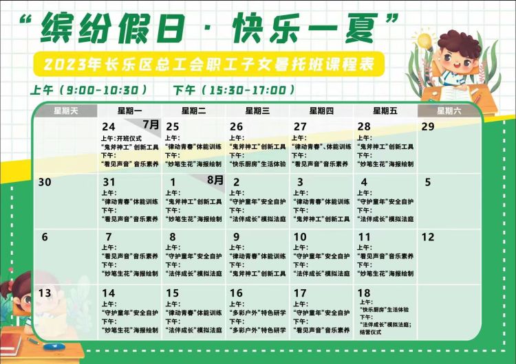 本次暑托班课程为期一个月,从课业辅导、亲子教育、法治教育、思想道德教育等方面着手,涉及音乐、绘画、体能、户外研学等多项活动,丰富多彩、趣味无穷。