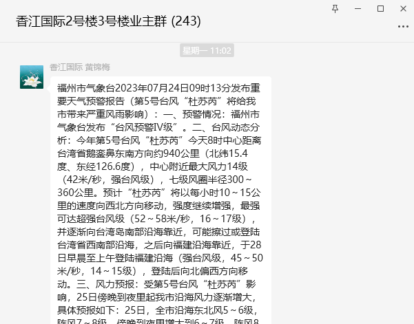 社区党员干部、物业通过电话及微信群提醒居民做好防台防汛准备工作,并温馨提示业主及时关注天气预报,注意用电和出行安全,关好门窗,注意室外物品摆放,防止高空坠物,减少外出等,告知居民一定要做好安全防范,提高全体业主的防汛防台和自护自救意识。