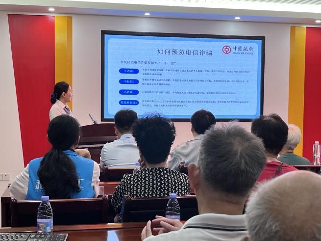 在活动现场,首先由中国长乐银行总支部的工作人员通过讲解、有奖竞答等形式向社区老年群体宣传国内发生的电信、网络诈骗违法犯罪案例和电信网络诈骗的骗犯罪分子的贯用手法、作案方式等方面知识。从微信诈骗冒充身份诈骗、网络购物诈骗、虚假绑架事实诈骗、中奖诈骗等常见的诈骗手段和技巧,教社区居民如何辨别虚假电话、短信,以及保护个人信息和银行账户安全,有效提高了社区老年群体对电信诈骗的防范、鉴别能力。