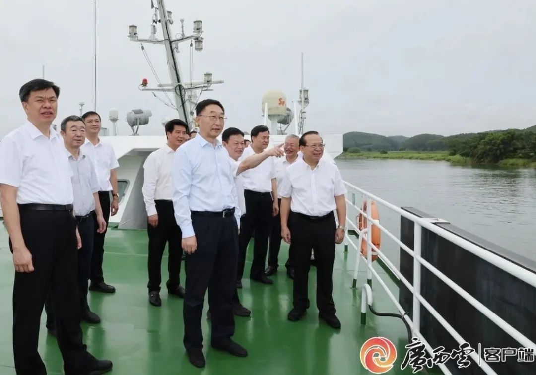 7月29日,自治区党委书记刘宁深入南宁横州市、钦州灵山县实地调研平陆运河项目建设情况。这是刘宁从横州市飞龙渡口乘船,一路沿江察看平陆运河项目建设、航道1标施工和水下施工作业有关情况。广西日报-广西云客户端记者?黄克 摄