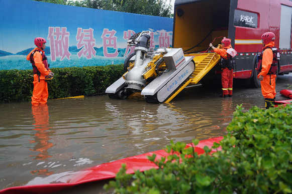 图为7月30日河北省邢台市内丘县消防救援大队消防员操控排涝机器人准备进行排水作业。