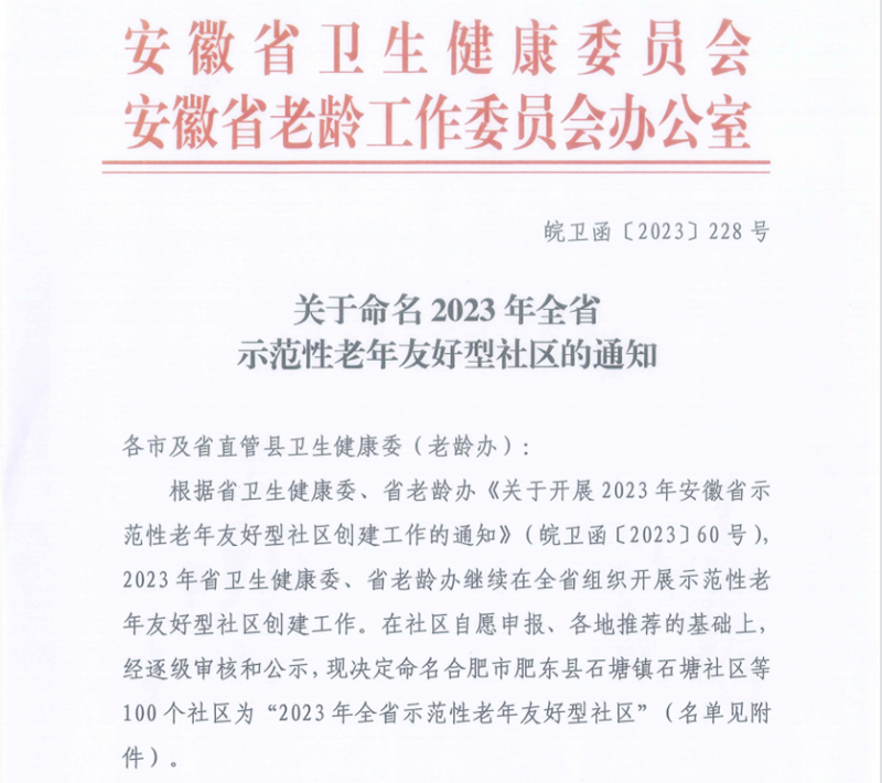 7月14日,安徽省卫生健康委员会和安徽省老龄工作委员会办公室联合发布《关于命名2023年全省示范性老年友好型社区的通知》,公布了100个社区为“2023年全省示范性老年友好型社区”,蚌埠市共有6个社区入选,其中禹会区的大庆街道锦绣社区及大庆街道九巷社区成功上榜!