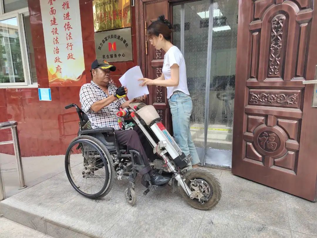 7月27日上午,贺兰县富兴街街道民生服务中心门口,一位坐着轮椅的残疾人来咨询办理残疾人临时救助,由于乘坐轮椅不方便到窗口办理业务,工作人员在门口热情接待,耐心细致的回答他的问题,帮助他填写了残疾人临时救助申请表,复印了相关证件,还详细给他讲解了接下来的办理流程,全程态度耐心语气温和,这位残疾人群众很感激,不住地向工作人员说着“谢谢、谢谢”。