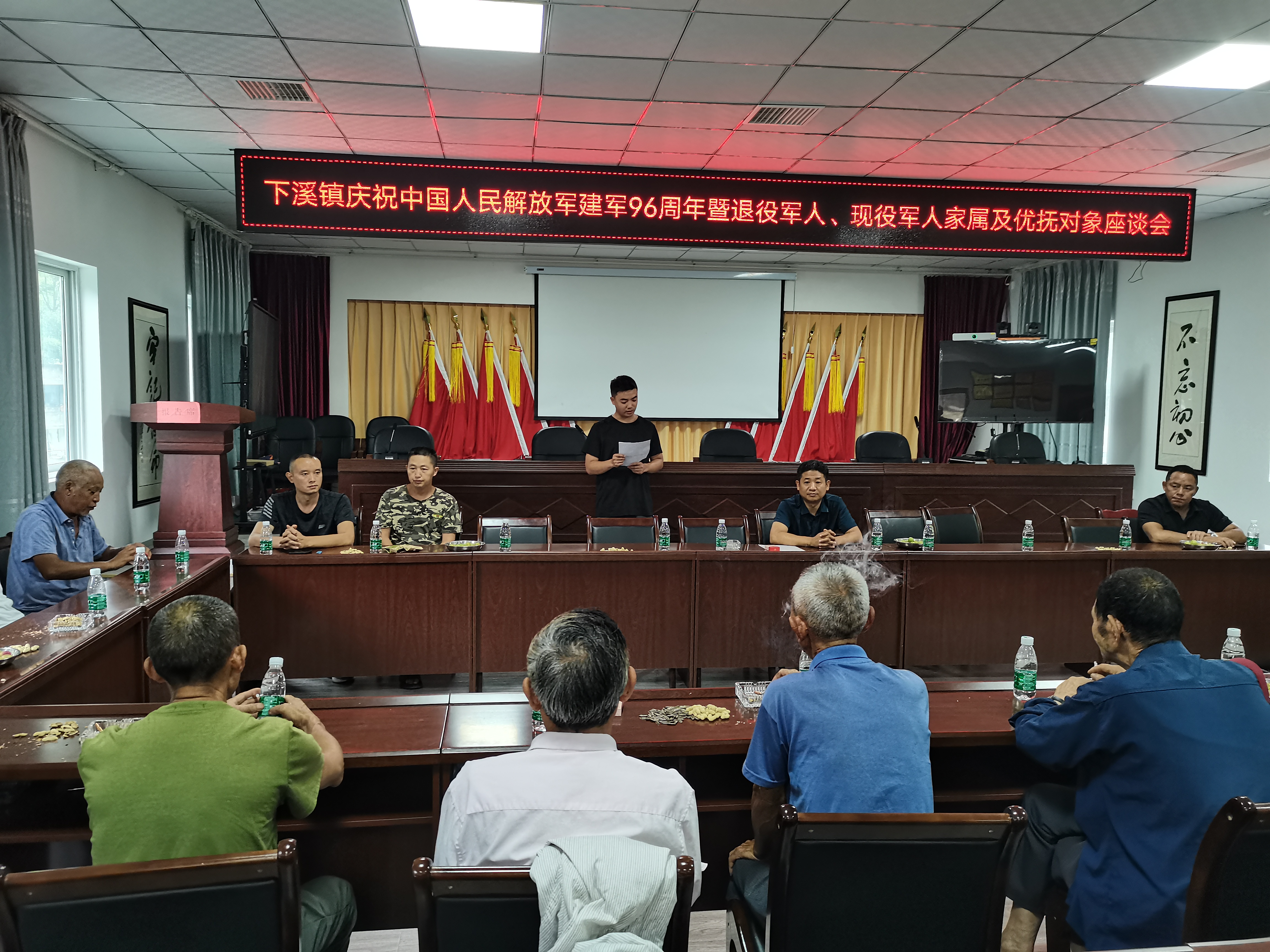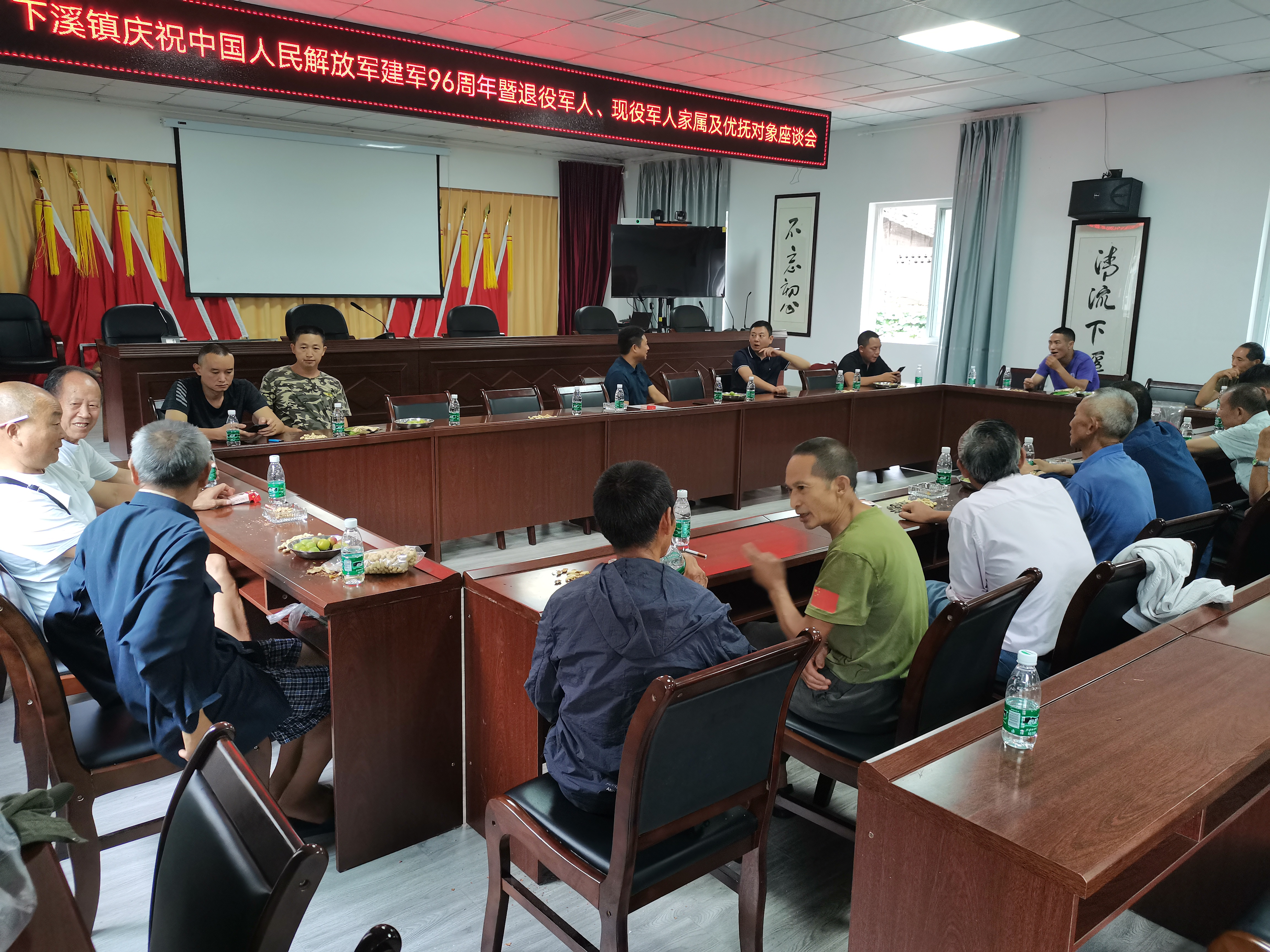2023年7月31日上午,下溪镇退役军人“八一”慰问座谈会在镇四楼会议室召开。为庆祝中国人民解放军建军96周年,做好退役军人慰问和关怀工作,镇武装部长同退伍军人代表20余人同庆建军佳节,共叙军民鱼水深情。