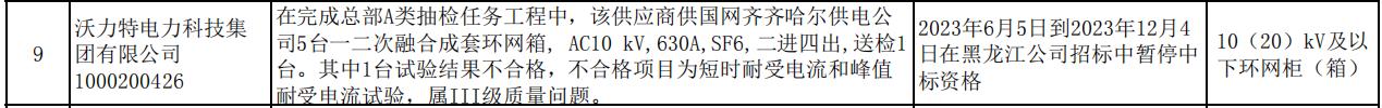 根据通报显示,在完成总部A类抽检任务工程中,沃力特电力科技集团有限公司供国网齐齐哈尔供电公司5台一二次融合成套环网箱, AC10 kV,630A,SF6,二进四出,送检1台。其中1台试验结果不合格,不合格项目为短时耐受电流和峰值耐受电流试验,属III级质量问题。2023年6月5日到2023年12月4日在黑龙江公司招标中暂停10(20)kV及以下环网柜(箱)中标资格。