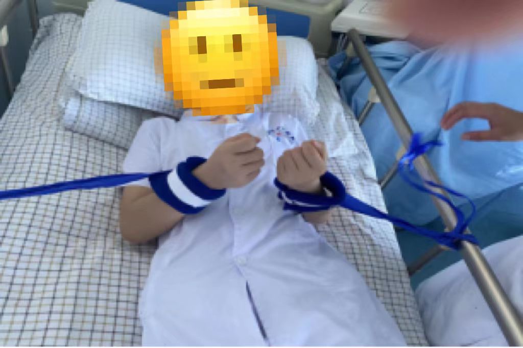 体验有明显攻击行为的病人使用约束带时,护士双手腕被约束固定在床档上,因被限制活动后极度不安,在用力拉、扯、拽约束带后,致手腕局部有明显的勒痕、破皮。