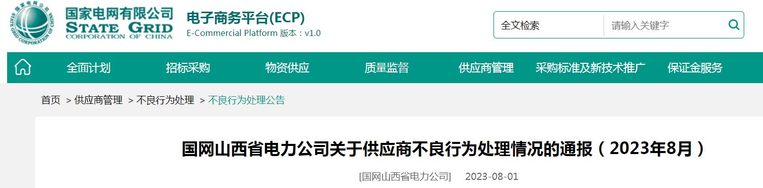 【电缆网讯】近日,国家电网电子商务平台发布《国网山西省电力公司关于供应商不良行为处理情况的通报(2023年8月)》。