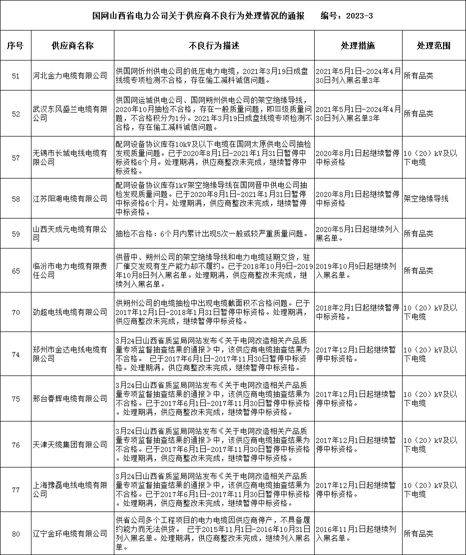 通报显示,河北金力电缆有限公司、武汉东风盛兰电缆有限公司、无锡市长城电线电缆有限公司、江苏阳湖电缆有限公司、山西天成元电缆有限公司、临汾市电力电缆有限责任公司、劲超电线电缆有限公司、郑州市金达电线电缆有限公司、邢台春辉电缆有限公司、天津天缆集团有限公司、上海豫磊电线电缆有限公司、辽宁金环电缆有限公司,在国网山西省电力有限公司发生不良行为,被山西公司暂停中标资格或列入黑名单。