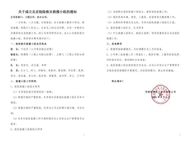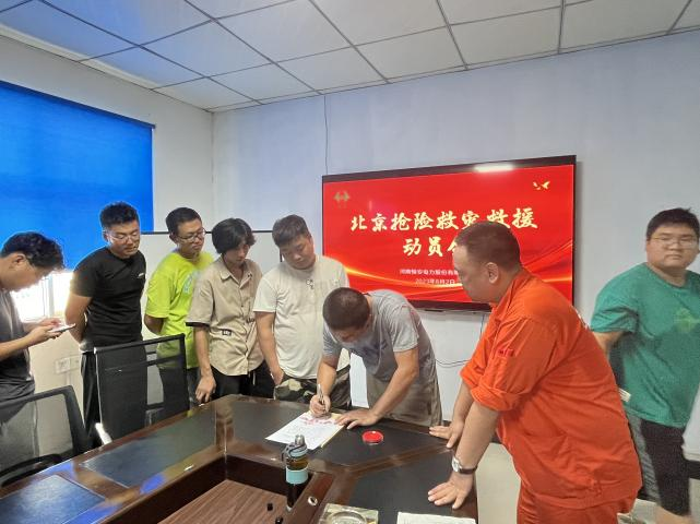 在了解到强降雨天气导致部分供电线杆及变压器受损,居民的日常用电受到影响后,8月2日,石佛园区辖区企业河南恒安电力股份有限公司召开会议,成立“北京抢险救灾救援小组”,众员工也纷纷请战。至此,共计20余人的救援小组成立,且成员都是参加过重大抢险救灾任务、经验丰富的“老兵”。