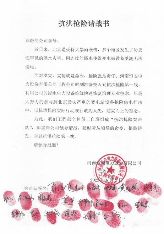 受台风“杜苏芮”影响,近日,北京、河北多地出现极端降雨,引发洪涝和地质灾害,牵动着社会各界的心。一方有难,八方支援,记者从高新区石佛园区运营中心了解到,辖区企业河南恒安电力股份有限公司成立的“北京抢险救灾救援小组”已抵达北京,在一线抢险救灾。