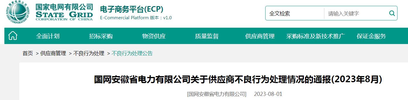 【电缆网讯】近日,国家电网电子商务平台发布《国网安徽省电力有限公司关于供应商不良行为处理情况的通报(2023年8月)》。