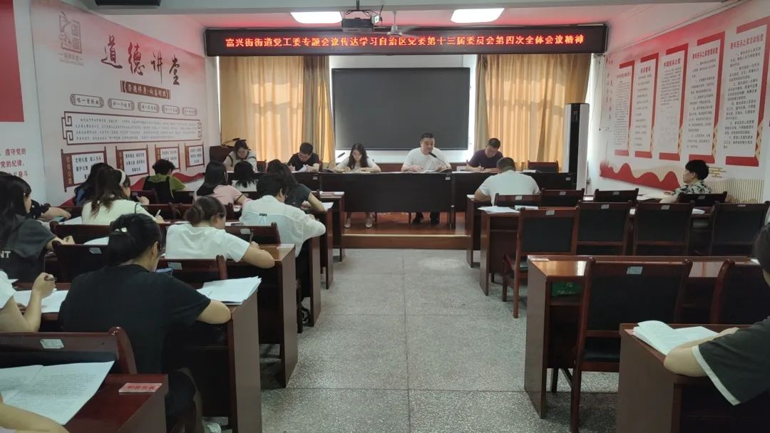 为深入学习宣传贯彻自治区党委十三届四次全会精神,推动会议精神落地生根,准确把握会议精神实质,进一步推动基层工作扎实开展,富兴街街道通过组织集中学习、线上线下宣讲等多种形式,传达学习了自治区党委十三届四次全会精神,认真对标全会的部署要求,结合实际谋划落实举措。