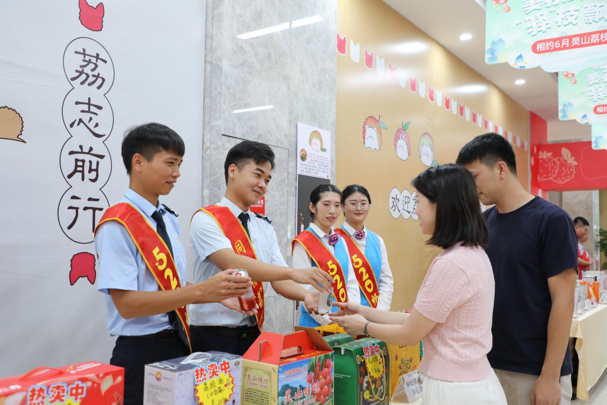 灵山高速公路运营分公司工作人员在服务区推销灵荔仔。