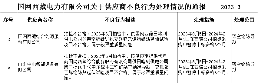 【电缆网讯】近日,国家电网电子商务平台发布《国网西藏电力有限公司关于供应商不良行为处理情况的通报(2023年8月)》。
